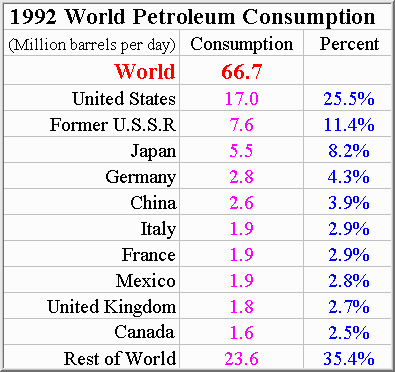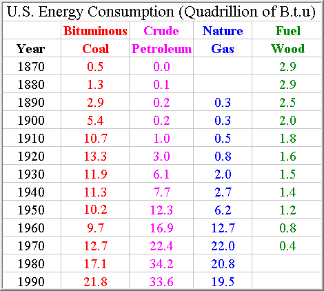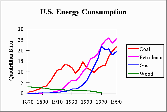 The modern American household is packed full of energy consuming devices all designed to make life a little easier. Central heating, air conditioners, fans, electric lights, ovens, microwave ovens, hot water heaters, washing machines, dryers, dish washers, refrigerators, freezers, television sets, computers, and who can forget the automobile; when used cumulatively consume huge amounts of energy. Despite having only about 5% of the worlds population, because of these modern convienences we claim a 30% share of the world's annual energy consumption. The non-renewable fuels used to supply this energy hungry lifestyle are shown below.